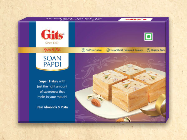 Gits Soan Papdi is not just a treat for the taste buds but also a visually tempting masterpiece. Loved by most customers for its super flaky texture, our soan papdi melts in your mouth leaving a sweetness that lingers in your palate. It is light brown in color due to the high quality of besan used and is garnished with finely chopped nuts.