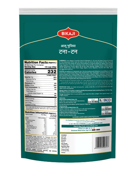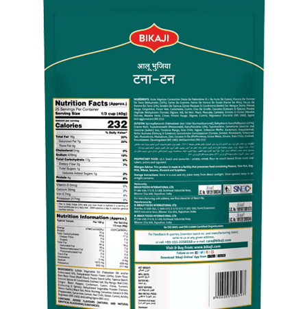 Edible Vegetable Oil (Palmolein Oil, Cottonseed Oil), Dehydrated Potato Flakes (20%), Gram Flour, Dew Bean Flour (Moth Flour), Potato Starch (4%), Tapioca Starch, Ground Spices & Condiments (Iodised Salt, Dry Mango, Red Chilli, Ginger, Black Pepper, Cardamom, Cumin, Clove, Turmeric (Colouring & Spices), Dehydrated Vegetable Powder (Tomato, Onion, Garlic), Black Salt, Mace, Nutmeg, Cinnamon, Extracts & Oils (Peppermint, Spearmint, Lemon, Red Chilli, Onion, Cumin), Acidity Regulator (INS 296)), Anticaking Agent (INS 551)