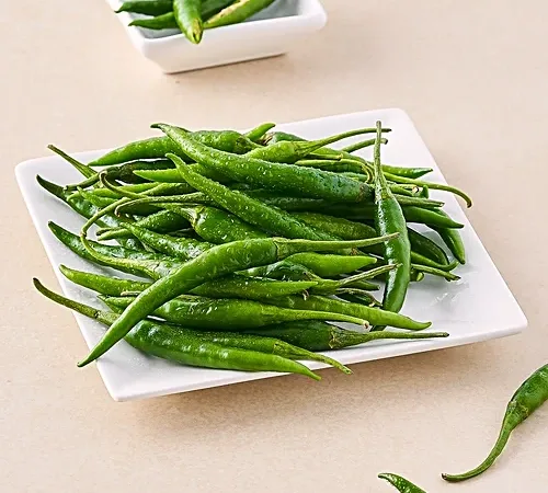 • Green chillis are the best kitchen ingredient to bring a dash of spiciness to recipes. The fresh flavour and sharp bite make them a must in almost all Indian dishes. This particular green chilli variety is big.