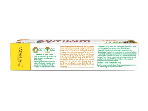 - Patanjali Ayurveda Dant Kanti Natural Toothpaste is herbal toothpaste containing herbs, ayurvedic ingredients, and essential oil. It effectively cleans and whitens teeth while promoting healthy gums and fresh breath. It can also help to prevent and reduce pain in the gums and teeth. It provides a refreshing smell and can help people get rid of bad breath. From offering dental protection to dental beauty, it works to guard and beautify your teeth. Patanjali Dant Kanti Natural Toothpaste contains various herbs, including akarkara, neem, babool, pudina, loung, pippali, bajranti, vidang, mesvak, and majuphal.